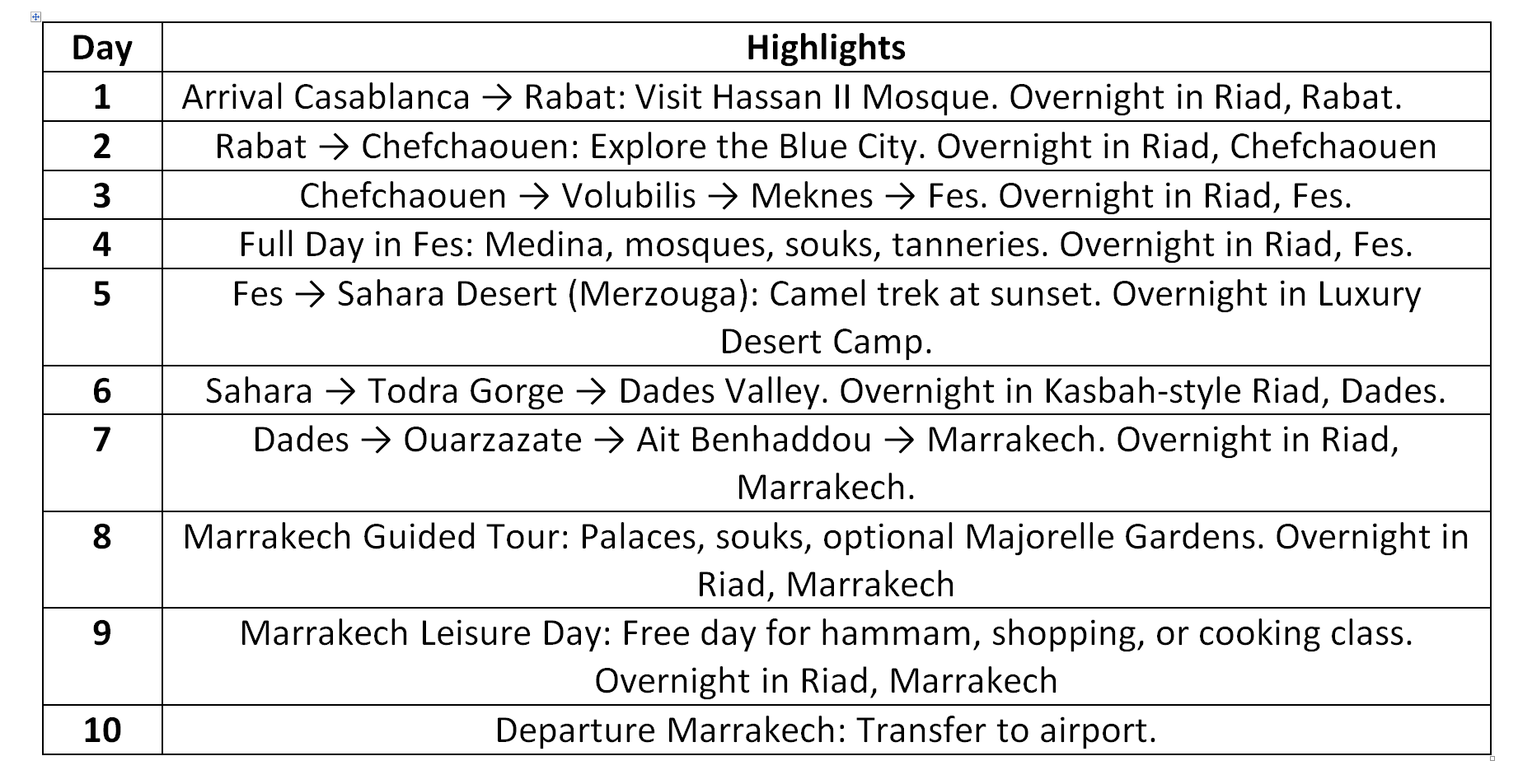 Unveil the colors, culture, and contrasts of Morocco in 10 unforgettable days. From the royal capital of Rabat to the blue streets of Chefchaouen, the timeless medinas of Fes, the golden Sahara dunes, and the vibrant energy of Marrakech—this journey blends history, adventure, and leisure. Stay in authentic Riads to experience Morocco’s legendary hospitality and architecture, and enjoy a night under the stars in a luxury desert camp.